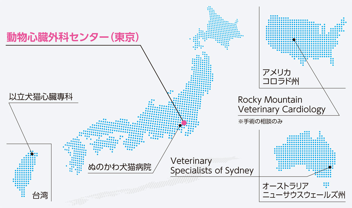 心臓外科手術の相談は下記病院にて可能です。お近くの病院に直接ご連絡ください。獣医師からのご相談も受け付けております。